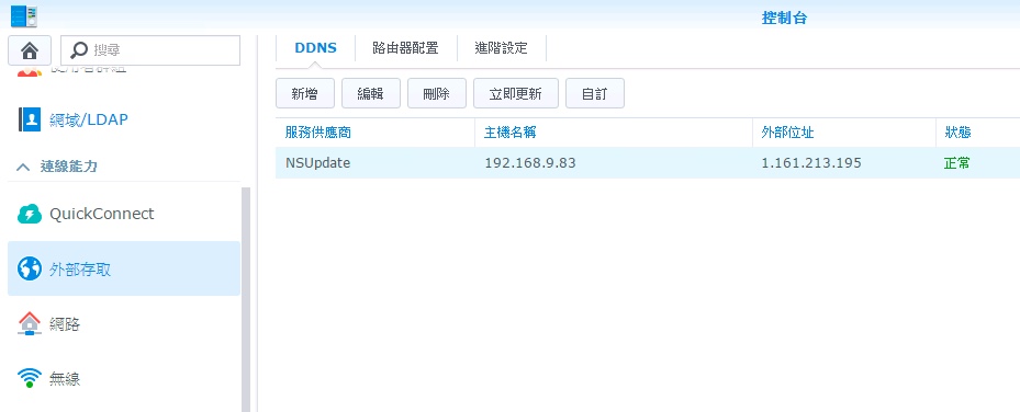 使用此功能主要一開始想要利用Synology NAS提供操作性極佳的DDNS設定介面,再利寫好的的Script去執行Synology提供的nsupdate更新自行架設的DNS Server,並且在Synology上新增一個自定DDNS更新的服務供應商,如此一來本來使用在動態IP的NAS就能有固定的網域名稱來使用: