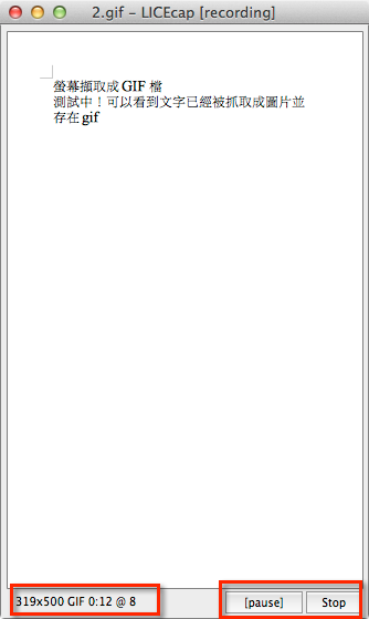 開始擷取時狀態會像左紅框處,上面註名了解析度319x500,已擷取時間0:12及動態擷取每秒張數8,