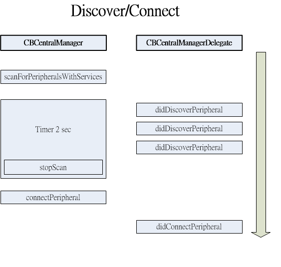 在這裡有個重點,連線成功後引發Delegate時,就必需要針對其CBPeripheral馬上進行discoverServices的動作,去了解週邊提供什麼樣的Services