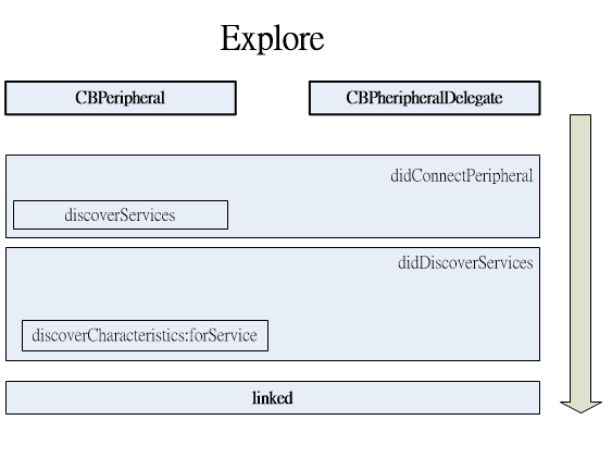 執行discoverServices之後又會引發另一個didDiscoverServicesDelegate,不過這會在Explore中介紹。