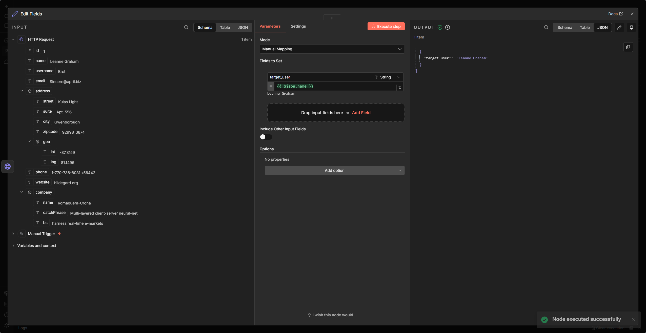 {{ $json.data.users[0].profile.email }}->test@example.com小技巧:在 n8n 節點介面中,直接把左側的欄位「拖拉」到 Expression 框框裡,它會自動幫你寫好複雜的路徑。