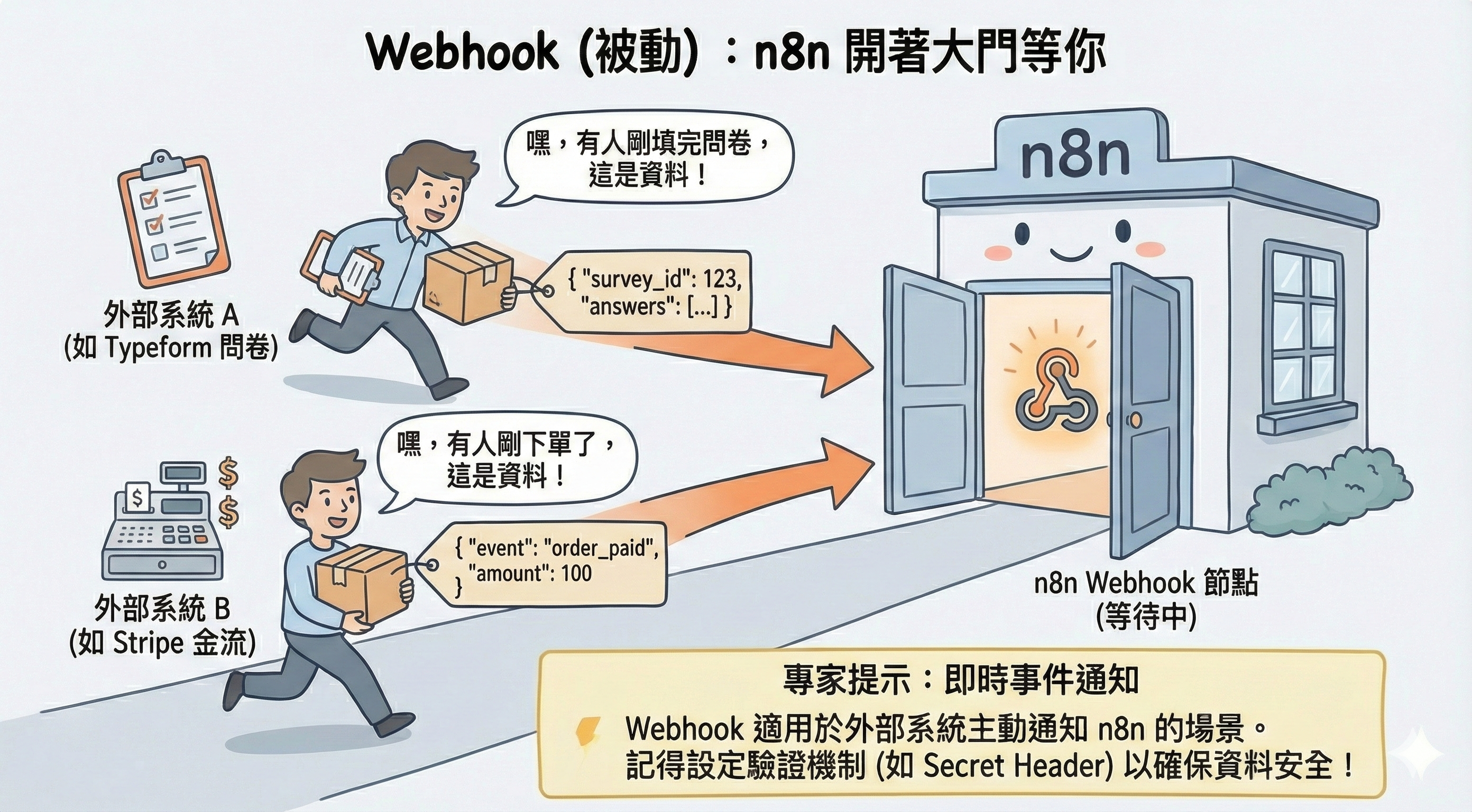 Webhook (被動):n8n 開著大門,等著外部系統(如問卷、金流)跑過來說:「嘿,有人剛下單了,這是資料」。