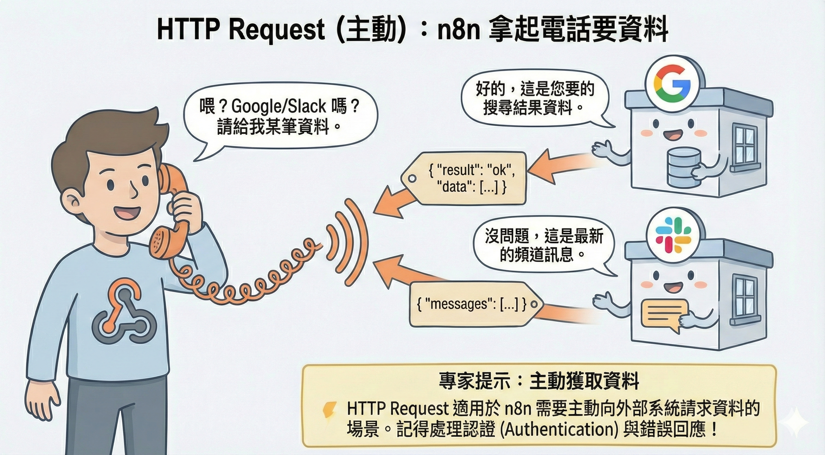HTTP Request (主動):n8n 拿起電話,打給外部 API(如 Google, Slack)說:「請給我某筆資料」。