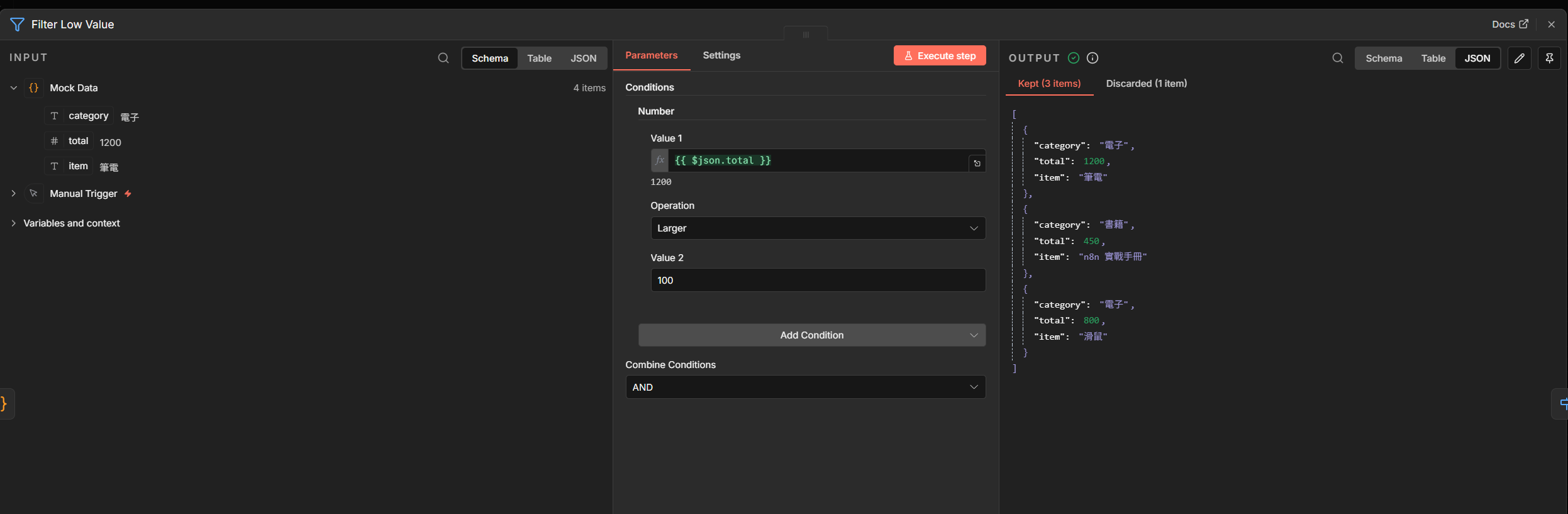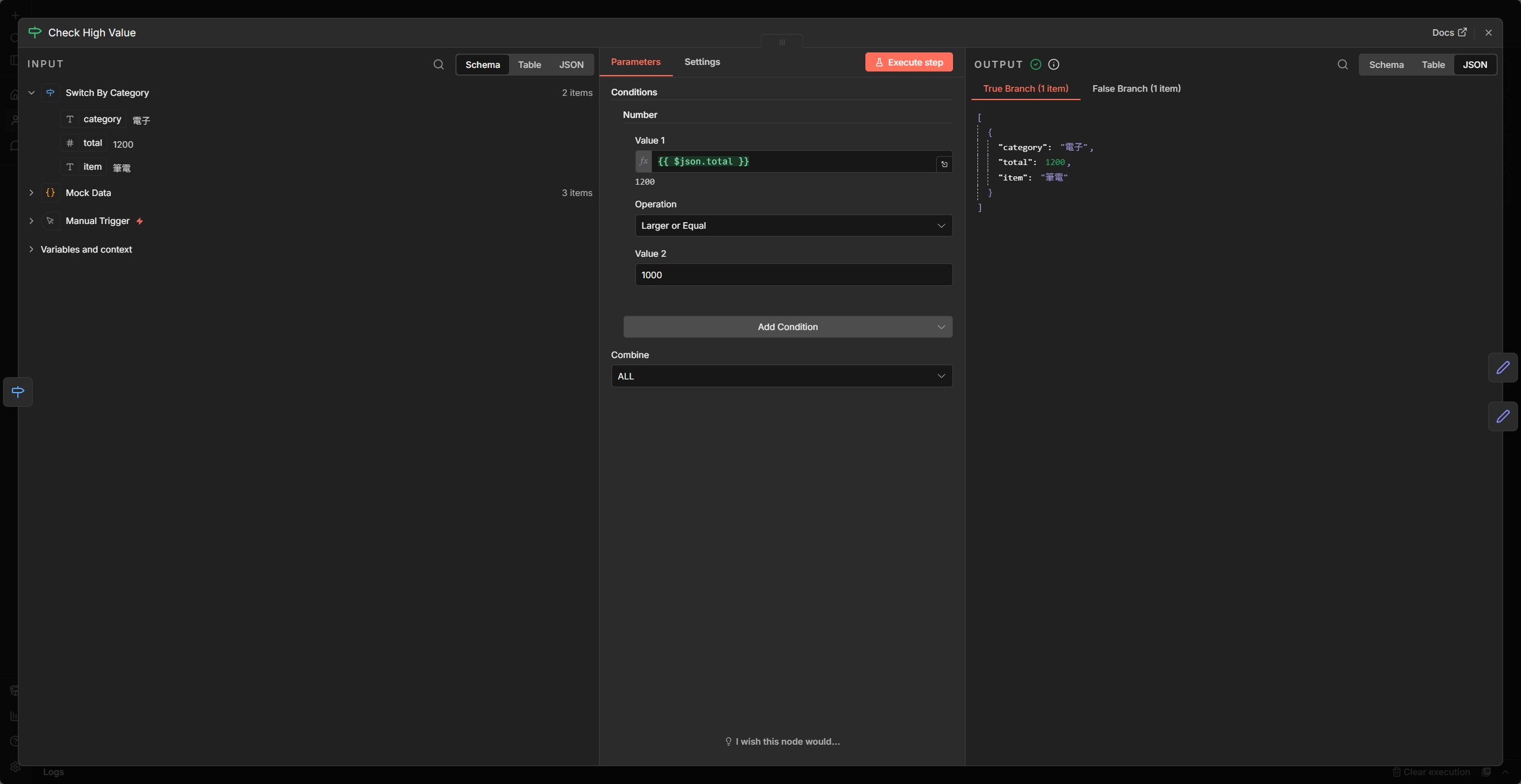 2. 設定:{{ $json.total }} >= 1000