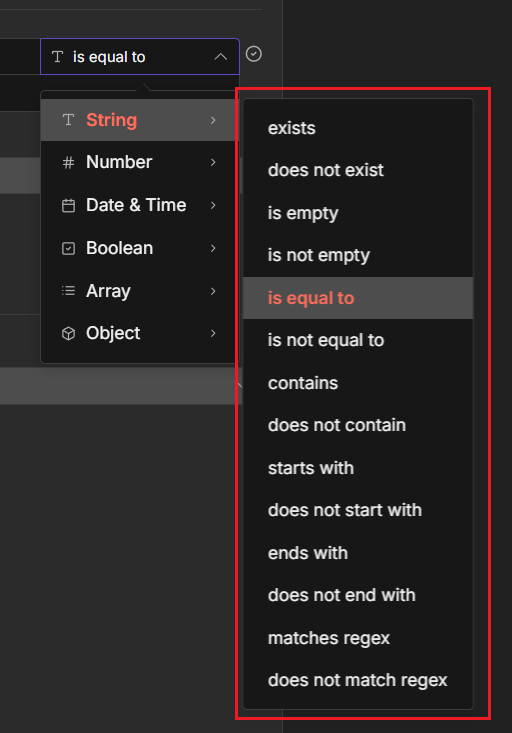 上述所提到的是較共同的比較方式,但每種類型都會再加入特有的比較方式,如圖中是String(字串),就會有字串比較會有的如:比較開頭、結尾、包含字串、還有更彈性的正規表示法(regex)。