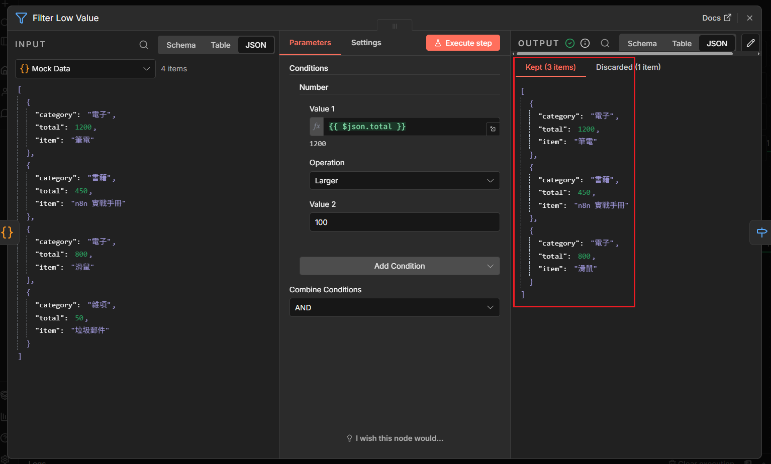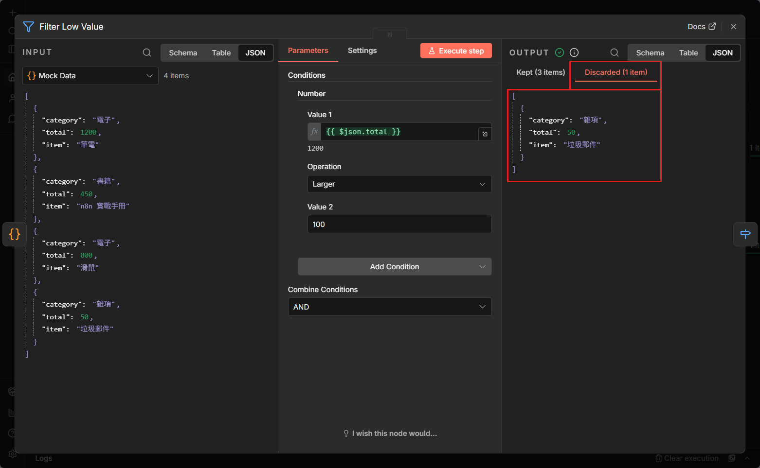 2. 多重篩選:先用 Filter 篩掉金額小於 100 的垃圾資料,再用 If 判斷資料是否具 email 欄位。