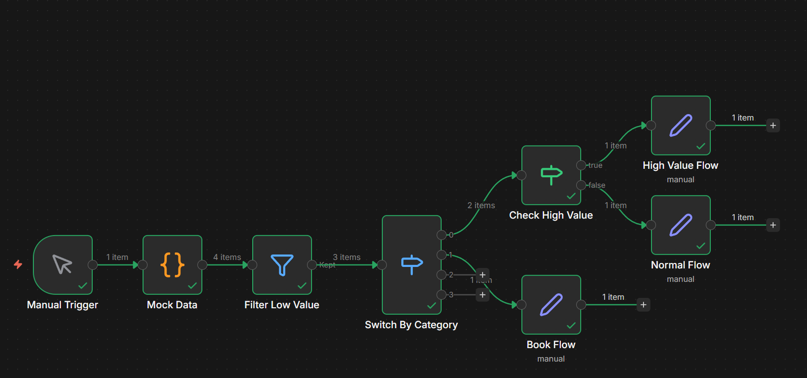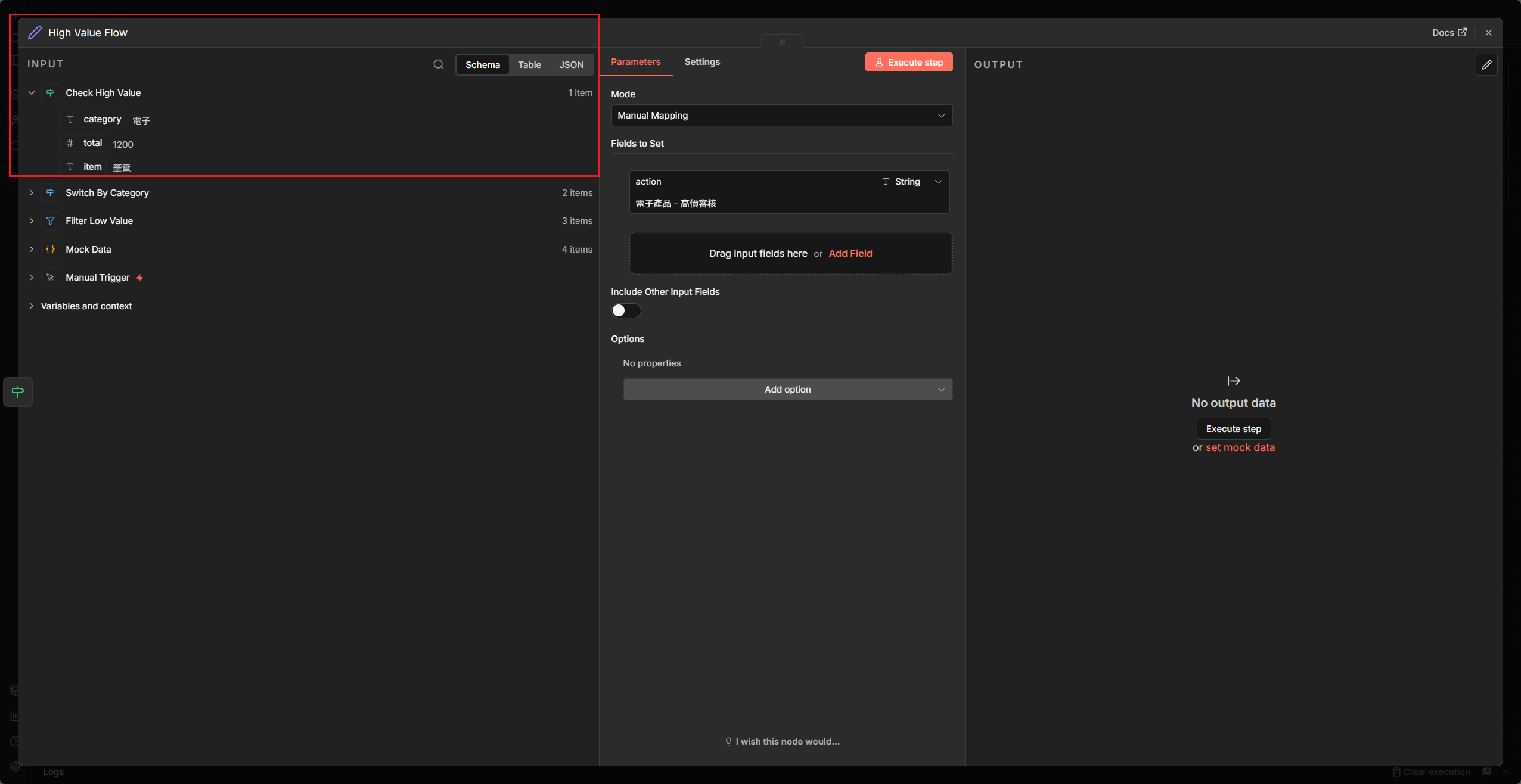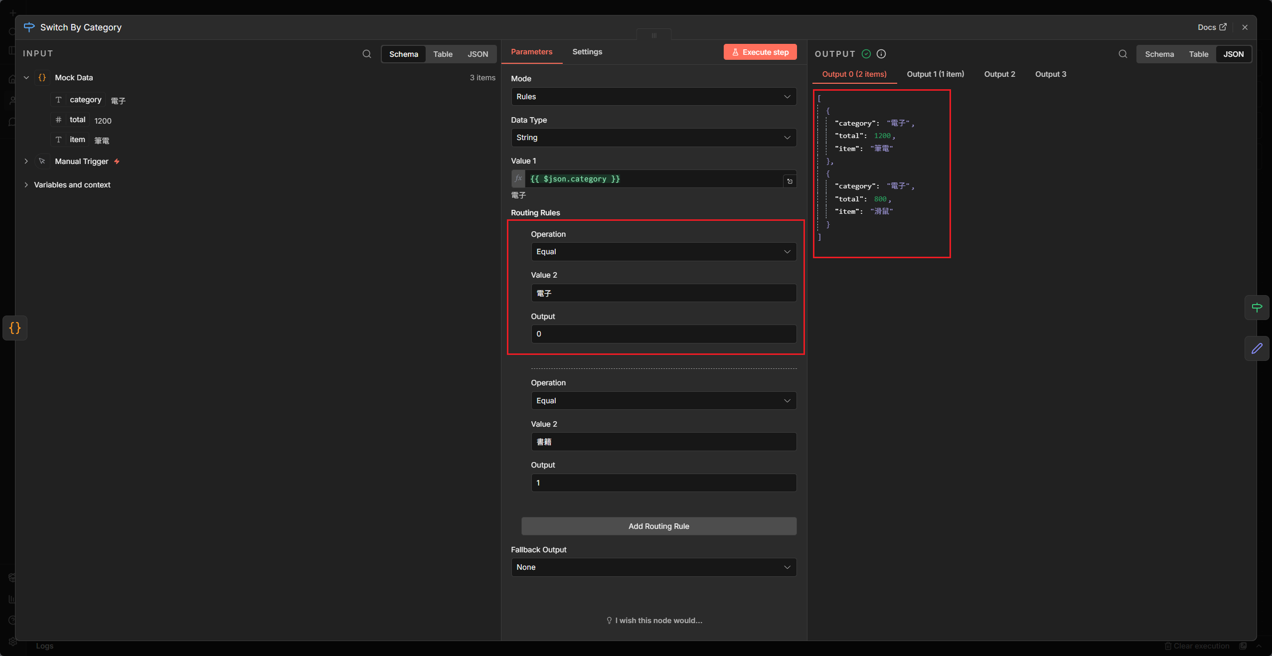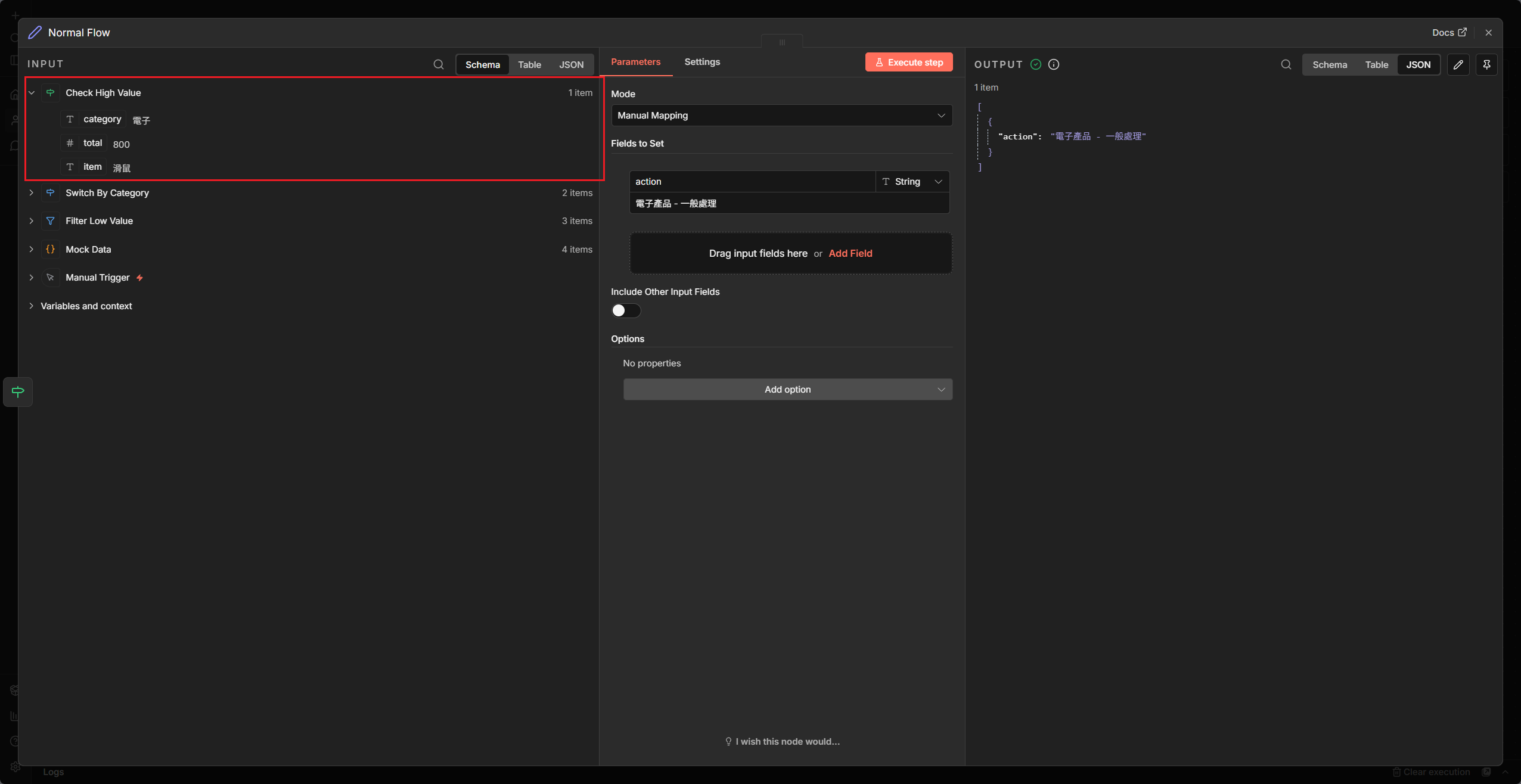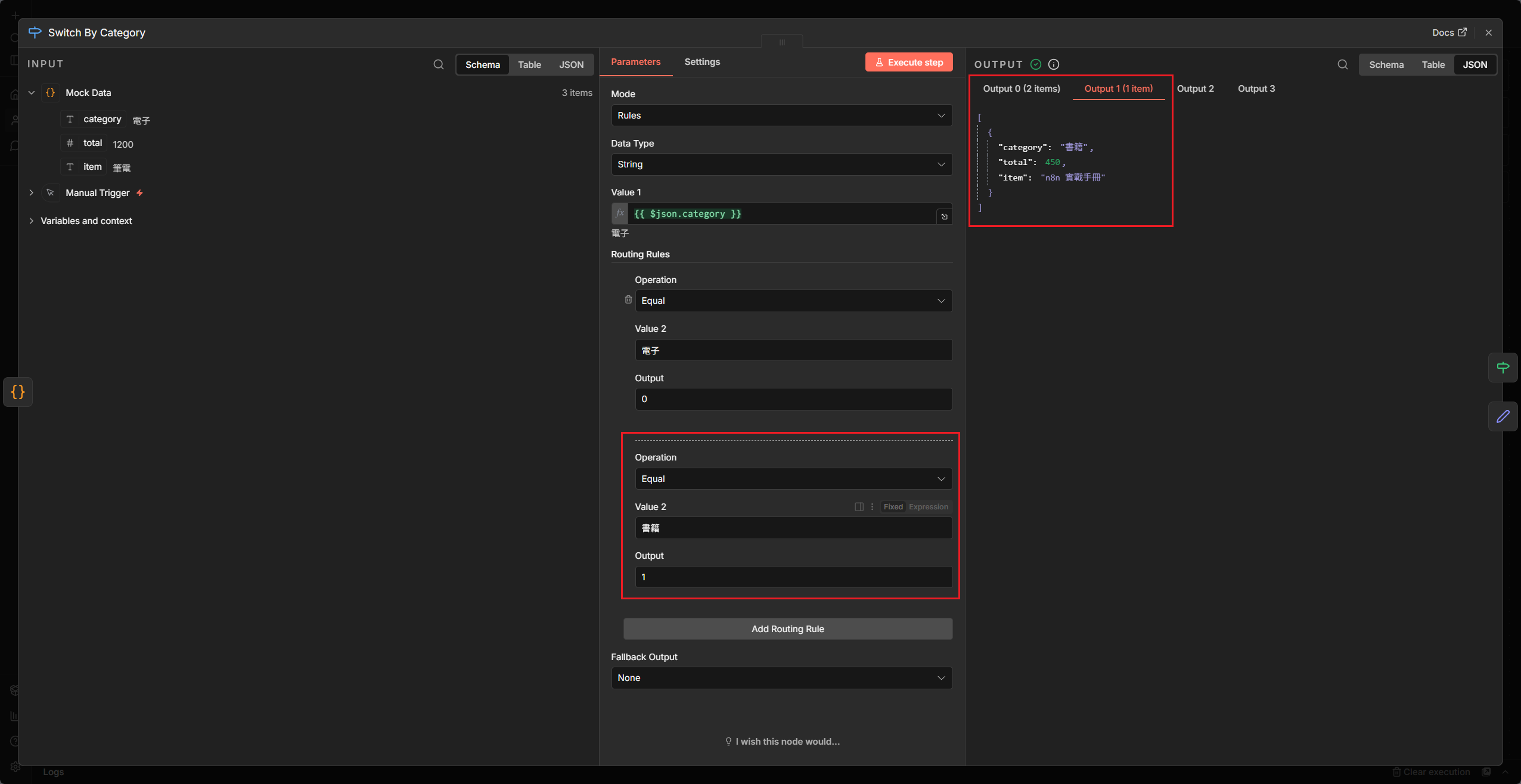 1. 分流大作戰:建立一個包含 5 筆不同類別資料的 Mock Data,用一個 Switch 把它們正確分流到三個不同的節點處理。