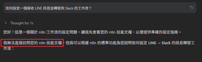 5. 開始對話 設定完成後回到 Agent 視窗, 你現在就可以直接詢問:「那現在你能查到 n8n 技能檔嗎?」