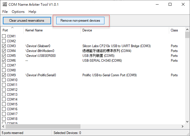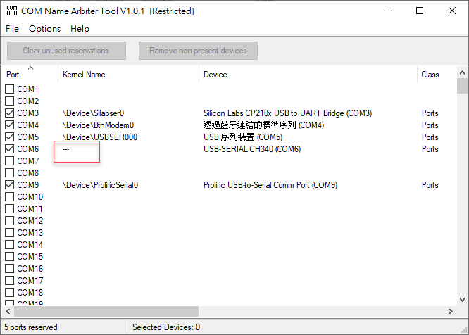 按下上圖紅框處的Remove non-present devices就會將未插電真正使用COM的名稱全刪除,此時Kernel Name上的--會消失此時COM6就不會被佔用: