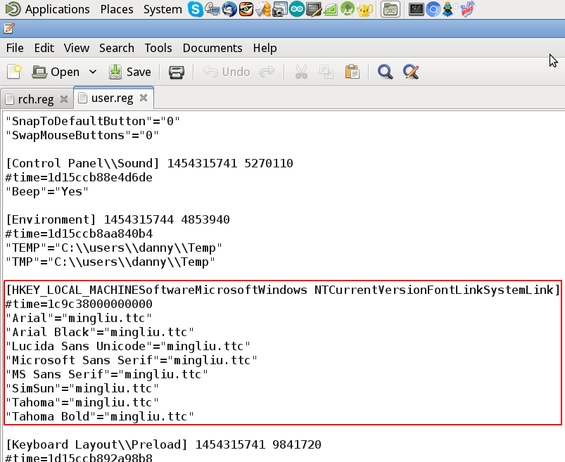 mingliu是指細明體中文字型,您也可以指定某個習慣的字型,並將字型copy至~/.wine/drive_c/windows/Fonts中,並將這些註冊檔資訊貼入~/.wine/user.reg,重新啟動或執要wine時,預設的註冊檔內容就會自行加入: