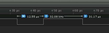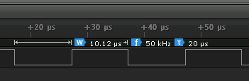 HIGH、LOW各維持10微秒(uS),所產生的是50kHz,但實際上的波形是如下: