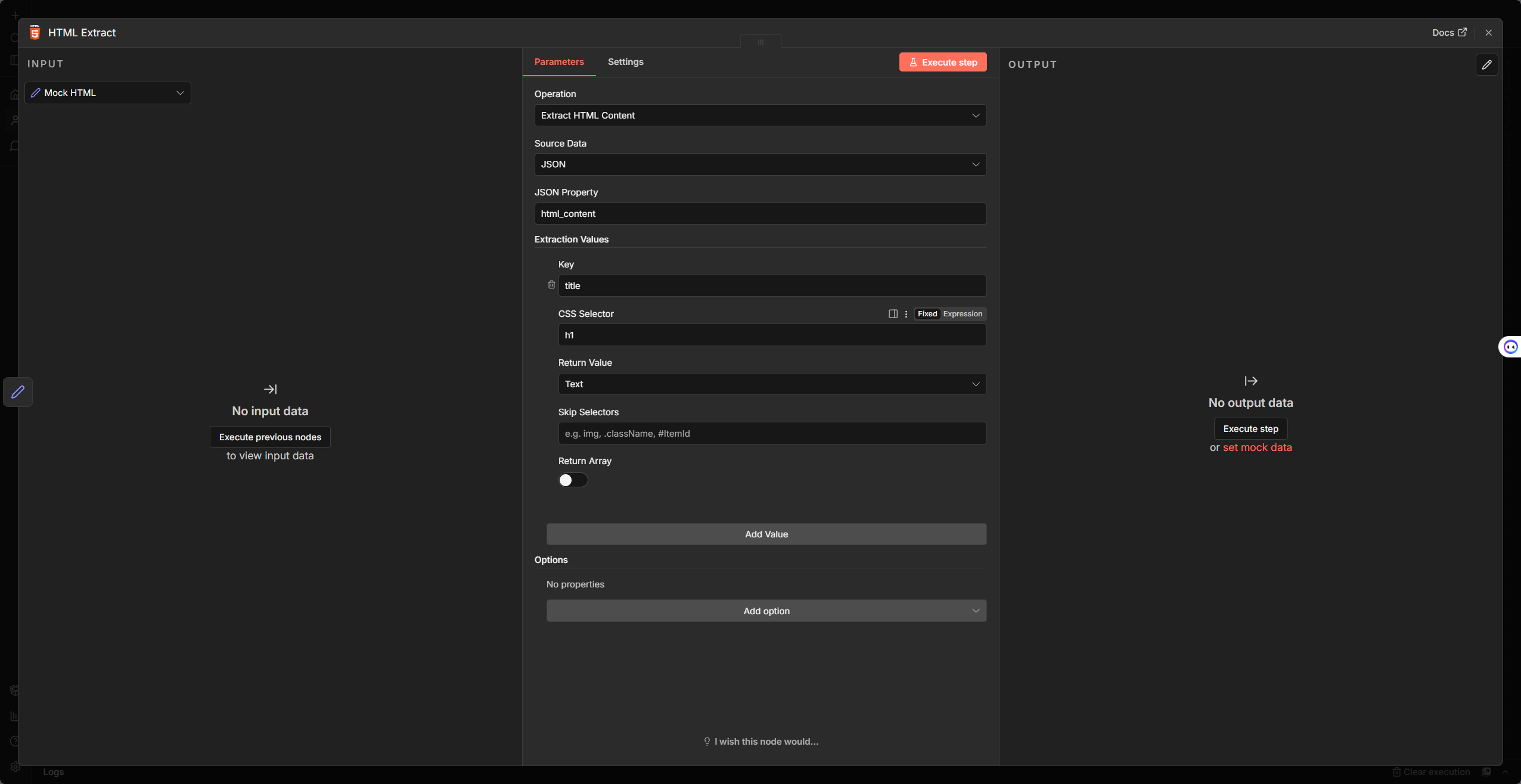 2. 使用 HTML 節點(操作選 Extract HTML Content)提取出 h1 的文字作為標題。