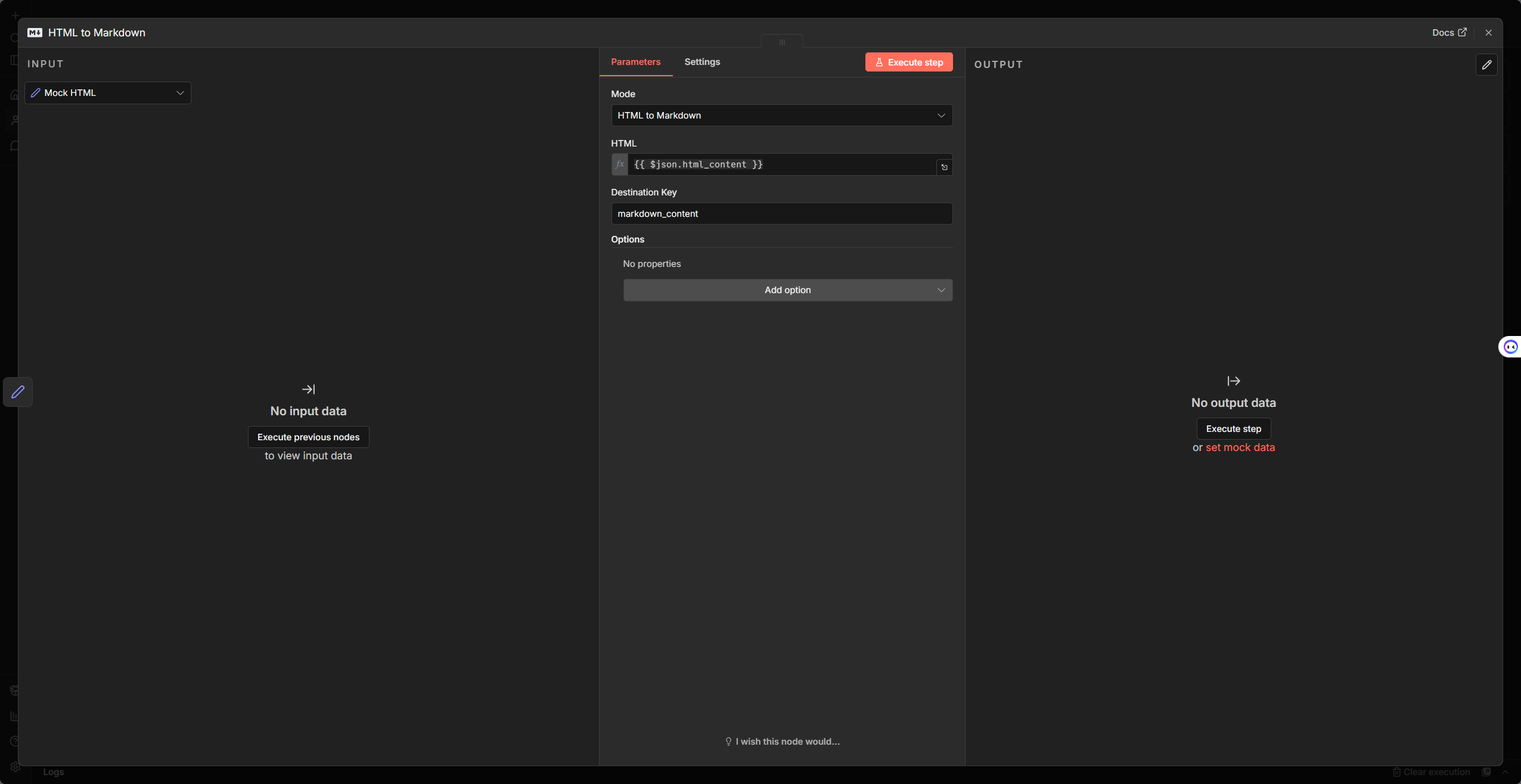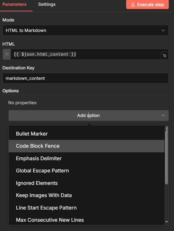 • HTML / Markdown:輸入要轉換的欄位(可用 Expression 如 {{ $json.html_content }})。欄位名稱會依 Mode 切換。