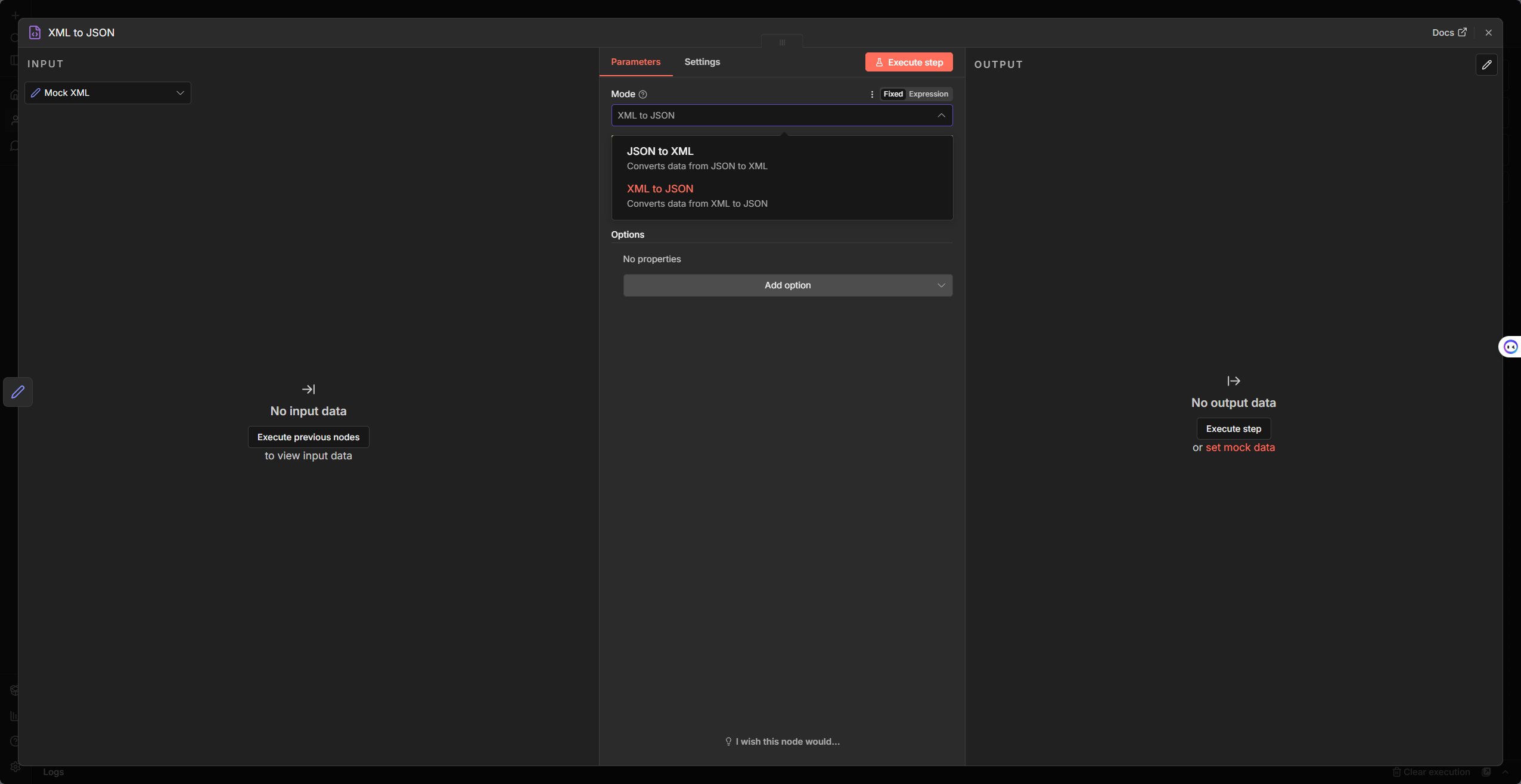 • Mode:選 XML to JSON(將 XML 轉為 n8n 易處理的 JSON)或 JSON to XML(反向轉換)。