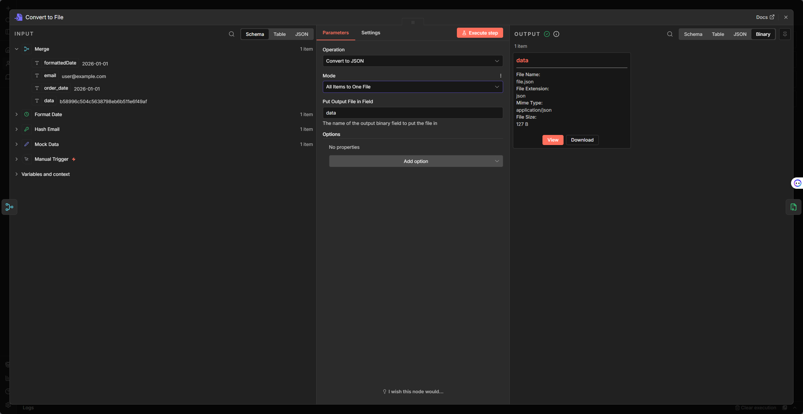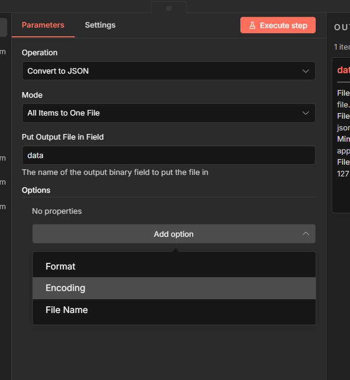 5. Convert to File:選 Convert to JSONtoJson)將合併後的 JSON 轉成 binary,寫入 data 欄位。