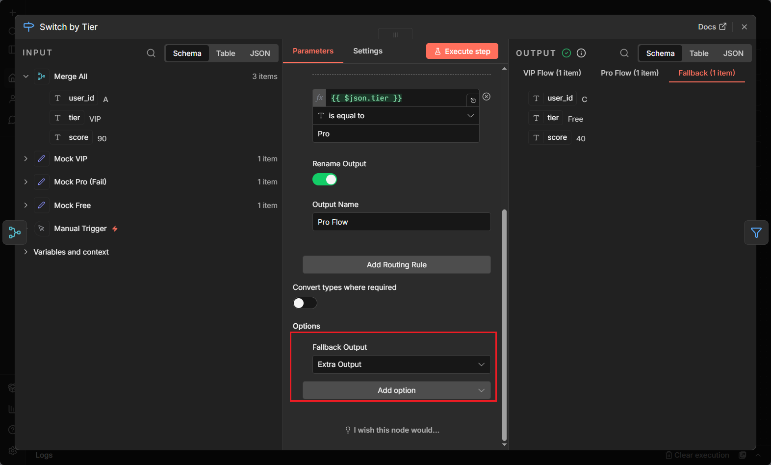 If 做 True/False 分岔很直覺,但當邏輯變成「VIP 走 A、Pro 走 B、其餘走 C」時,多個 If 串接會讓流程圖難以維護。SwitchRules 模式讓每條 Routing Rule 對應一個出口,再搭配 Fallback Output(Extra Output)把「不符合任何規則」的 Item 集中到同一出口,結構一目瞭然。