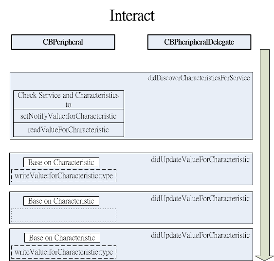 從前面一系列的文章下來後對於掃描、停止掃描、連線、斷線、服務、屬性的使用都很清楚的了解,最後這篇文章要進入如何利用屬性與BLE週邊溝通獲取資料,藍牙 BLE CoreBluetooth 初探 中有張示意圖用來參考接下來要做的事情: