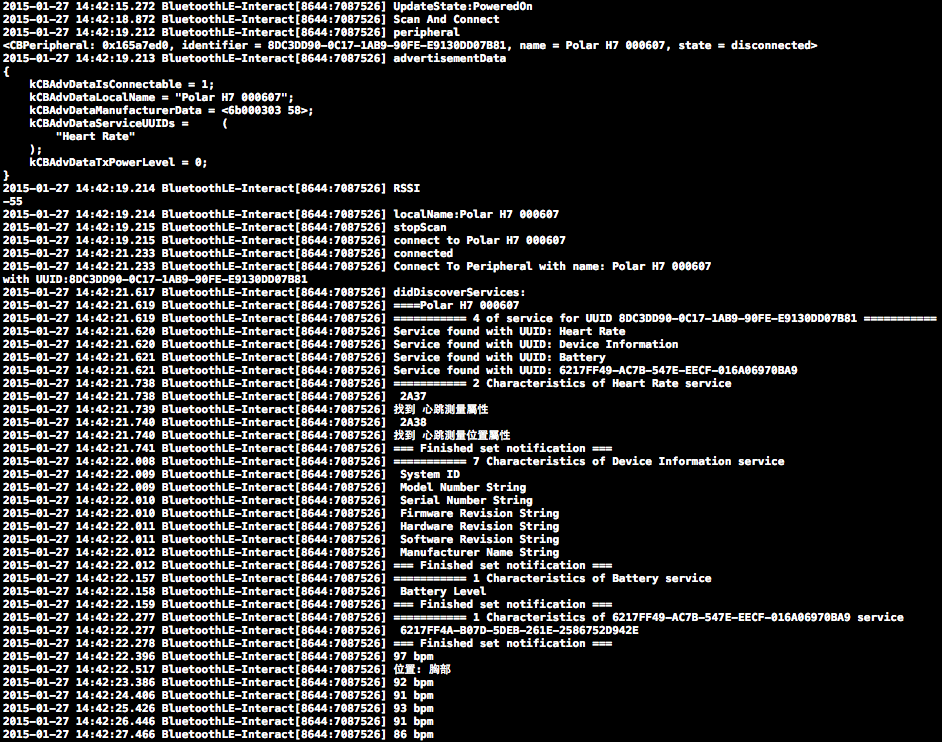 2015-01-27 14:42:21.233 BluetoothLE-Interact[8644:7087526] Connect To Peripheral with name: Polar H7 000607
