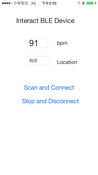 如此,承之前的BluetoothLE-Explore範例程式進行修改後,您按下Scan and Connect後就會看到心跳測量的值:
