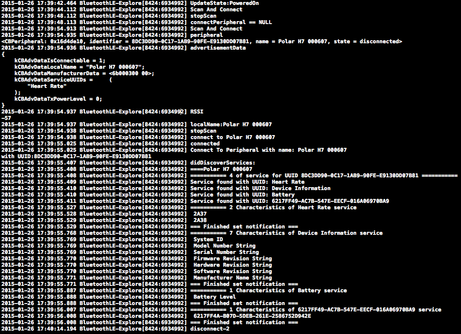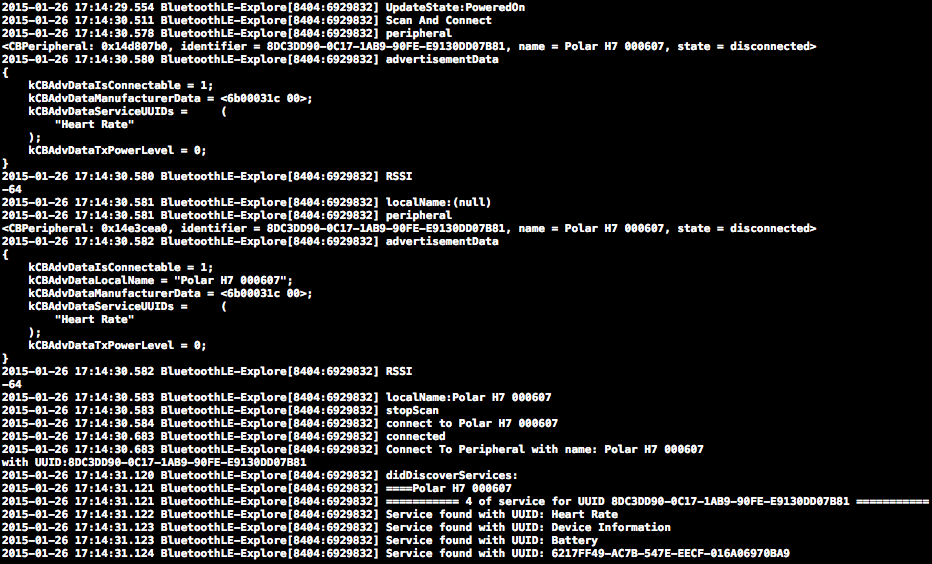 2015-01-26 17:39:55.025 BluetoothLE-Explore[8424:6934992] Connect To Peripheral with name: Polar H7 000607