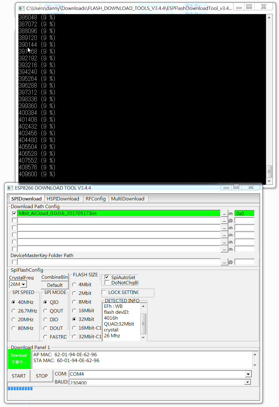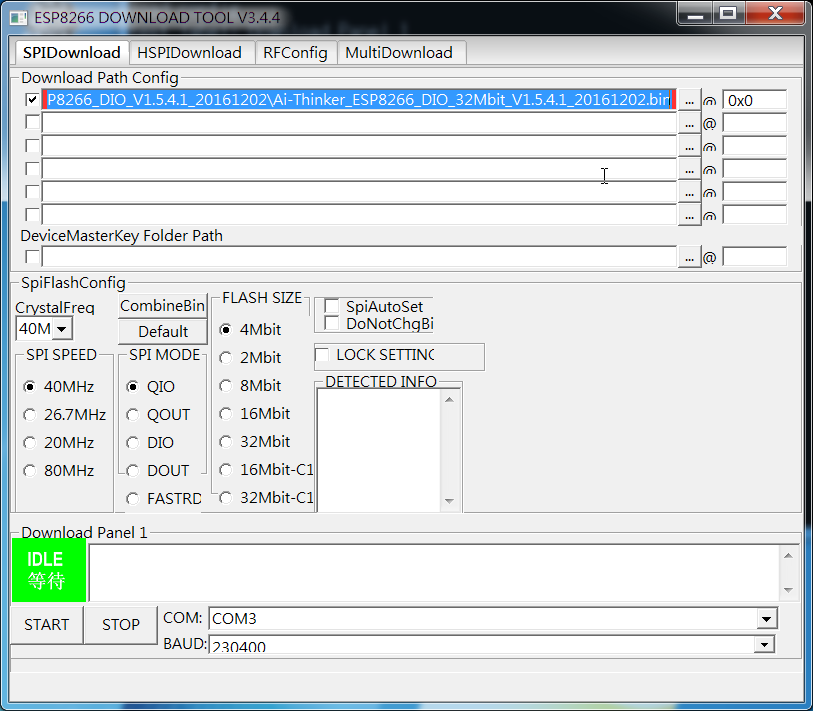 基本上SpiAutoSet勾選後,設定值程式會自動偵測,除非你有特定需求,如:32Mbit flash,但要燒錄的韌體是給8Mbit的Flash,那就要手動選擇(SPI SPEED/MODE/SIZE),並且將DoNotChgBin、SpiAutoSet勾選取消再進行更新即完成,另外燒錄細節也可以參考安信可官方提供的:如何为 ESP 系列模组烧录固件