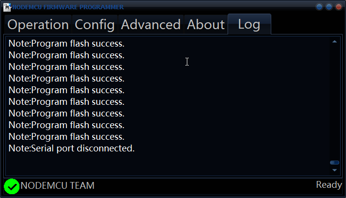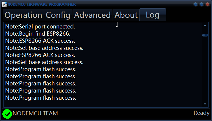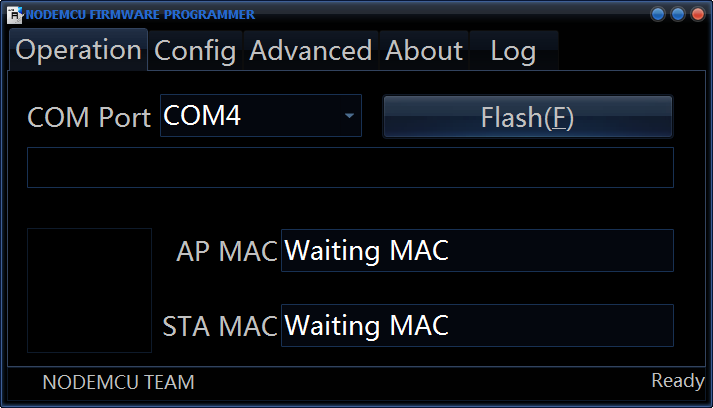 ESP8266一開始會受歡迎也是因為有名為NodeMcu所製作的開發板,它內建支援Lua語法,可以利用Serial console進行程式的線上編寫,該官方也提供一款專為NodeMcu使用的上傳程式,不過它也可以使用在其他的ESP8266開發板。,主程式分為: