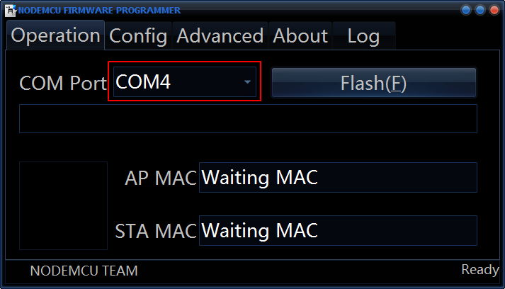 選擇Serial埠,COMx,如果你執行程式之前已經連接好ESP8266,那程式會自動選擇,如果沒有就到裝置管理員查看
