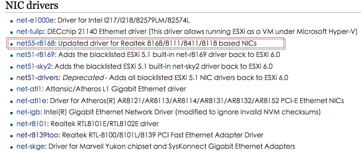從ESXi 5.0支援Realtek系列的驅動程式是其中一個亮點,不過好景不常的在5.5後就策略性的將它支援取消,連一些消費性主機板上的SATA晶片組驅動也一併給取消了,雖然如此,網路還是有蠻多網友建立一些方法讓舊有的驅動程式在新版的ESXi上驅動。
