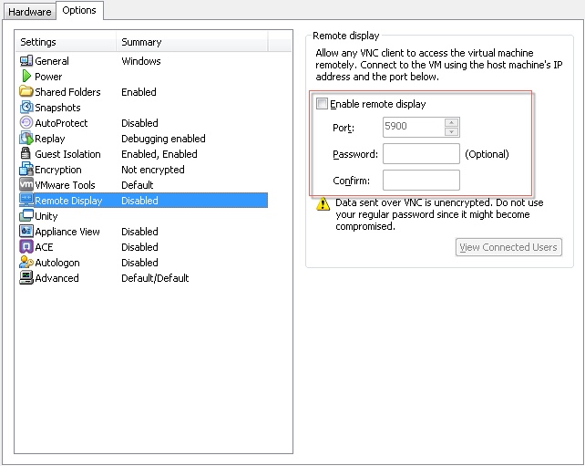 使用過VMware Workstation都會知道能在VM設定中指定VNC Port來透過VNC協定取得VM的畫面,這能使得一些系統即使不用開啟或另外安裝軟體行使遠端搖控也是能操作,例如:DOS、Linux console。