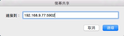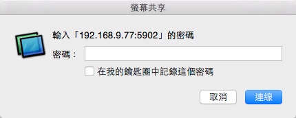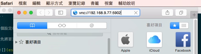 OS X內建VNC Client,在網址列上輸入vnc://address:port就能叫出內建的螢幕共享程式: