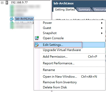 首先將要更改設定的VM關閉,並點選它進行設定: