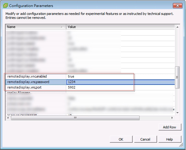 註:透過vSphere Client來設定與增加參數才能自動的新增remotedisplay.vnc.key,它是password的hash值,如果您是透過文件編輯的方式要將其key值補上其密碼才是有效的。