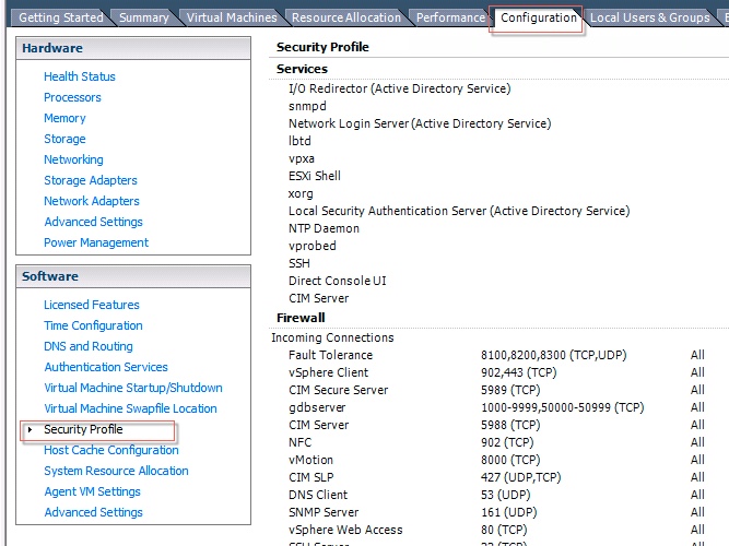 首先利用vSphere Client登入ESXi Server後,進入Configuration的Security Profile