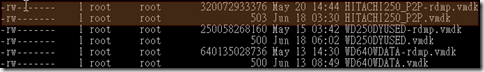 上圖中反白處可以看到檔案已經建立完成,並且會產生HITACHI250_P2P-rdmp.vmdk與實體容量相同的檔案,之後我們再使用 vSphere 將設定檔HITACHI250_P2P.vmdk載入。
