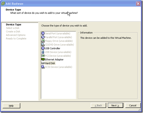 選擇 Hard Disk 並按下 Next 進行下一步,