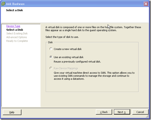 不管是實體進行虛擬化之後或是虛擬化之前,原有硬碟資料使用上除了可以將檔案備份至虛擬硬碟環境中使用,還可以直接將實體硬碟給虛擬機器使用,使用上也是利用vmkfstools並配合命令z來完成它。