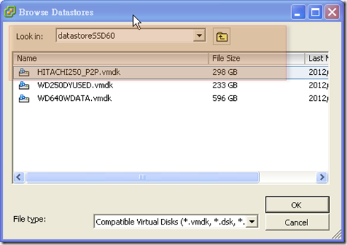 選擇我們剛建好的HITACHI250_P2P.vmdk,然後按下 OK