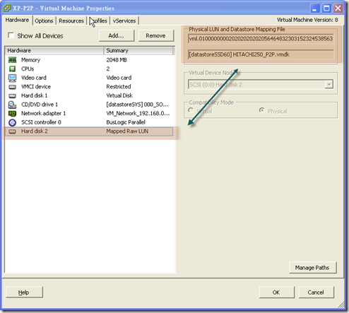 之後,可以看到反白處的資訊,按下 OK 就完成在掛載實體硬碟至虛擬機器內,不過可以觀查的是,在ESXi模式下掛載這類檔案是模擬 SCSI 連接方式,進入虛擬機器之後與一般的虛擬硬碟一樣的使用方式,但好處是,當您想要存取資料時,可以直接將硬碟拆下,並接入實體機器的環境中還可以直接存取使用,這個便利性在某些應用場合還是會被使用。