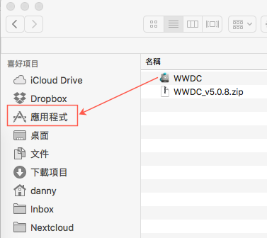 解壓完成後會看到App,再將WWDC拖拉方式拉至應用程式