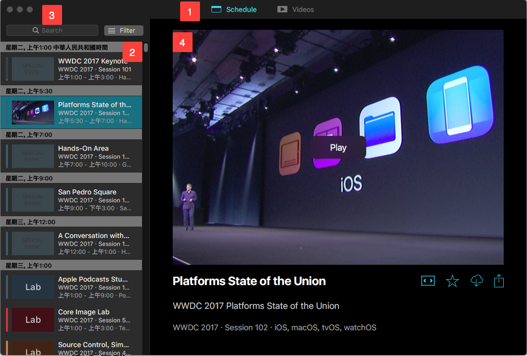 選擇Schedule後會依照日期時間排列將相關的影片列表,另外的Videos選擇後會依照開發的屬性,像Media、Developer Tools、System Framework...等。