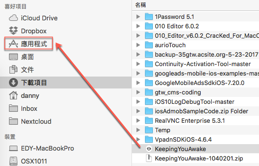 再將KeepingYouAwake拖拉至應用程式就安裝完成,接下來執行它。