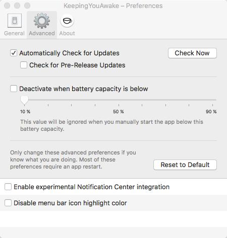 以及勾選Deactivate when battery capacity is below能設定電池量量低於設定值時取消防止睡眠的功能,避免可能忘記設定,而讓電池整個耗盡無法做其他事情。