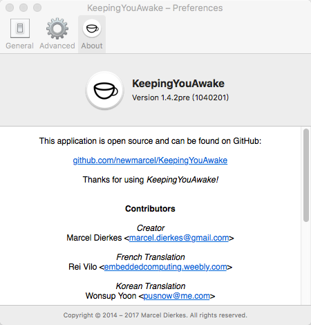 About選項提供貢獻名單及一些與KeepingYouAwake有關的說明: