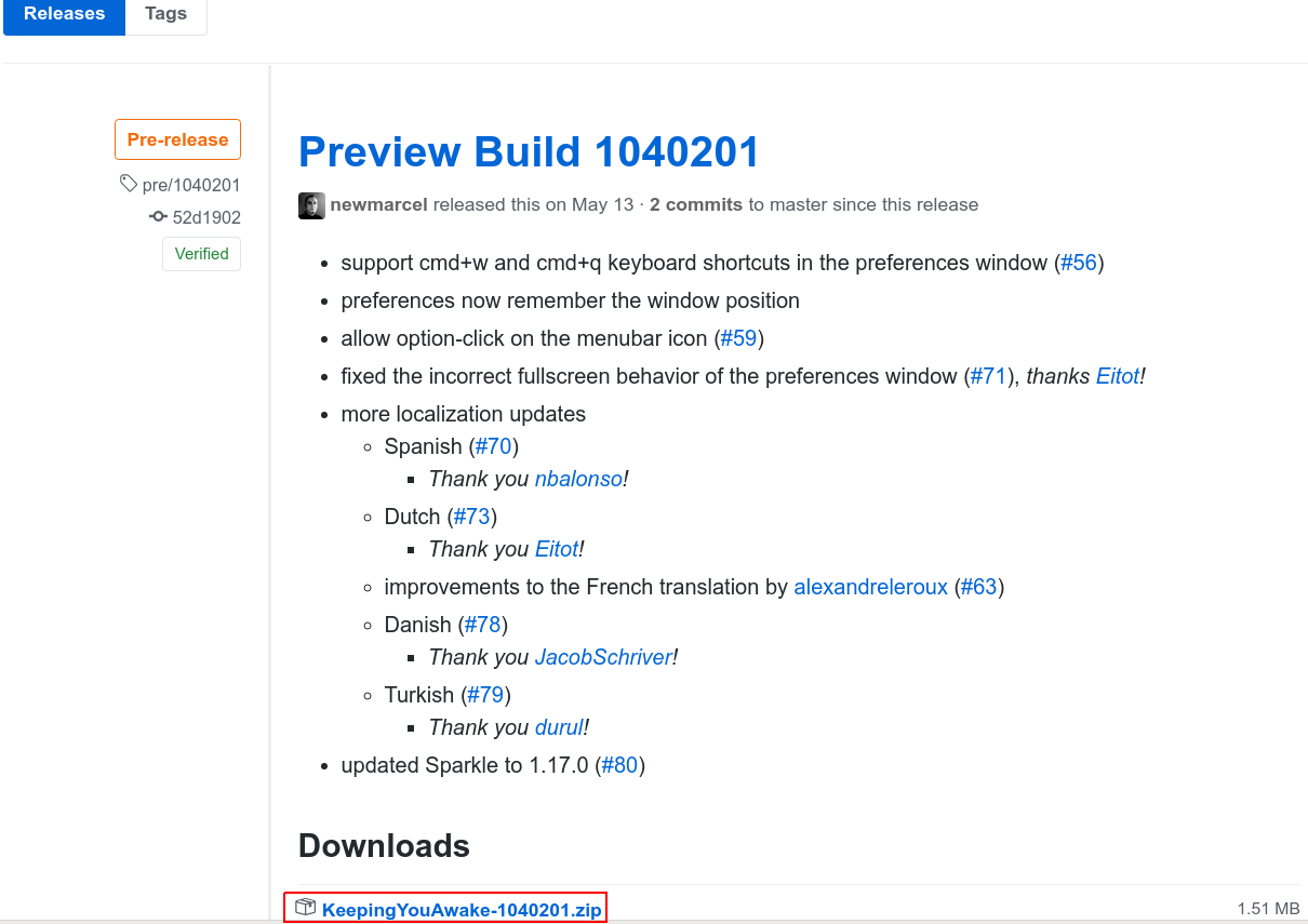 每個版本都有提供已經編譯好的可安裝程式,按下Downloads中的KeepingYouAwake-xxxxx.zip進行下載,下載後將檔案解壓縮,