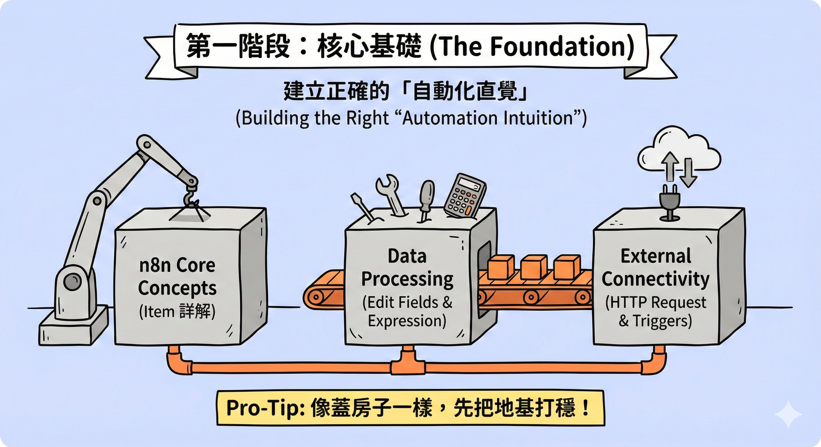 這個階段的核心目標只有一個:建立正確的「自動化直覺」。你會學會 n8n 如何看待資料,並掌握與外部世界連結的最基本工具。