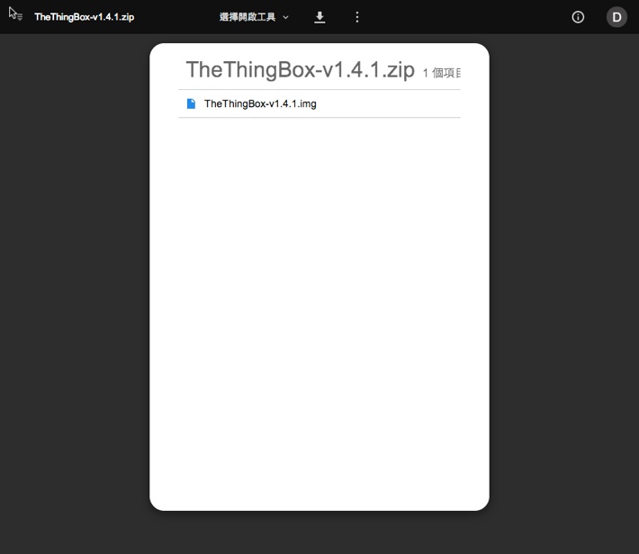 ThingBox目前的版本是1.4.1下載後請將TheThingBox-v1.4.1.zip壓縮檔解開成原本的映像檔TheThingBox-v1.4.1.img